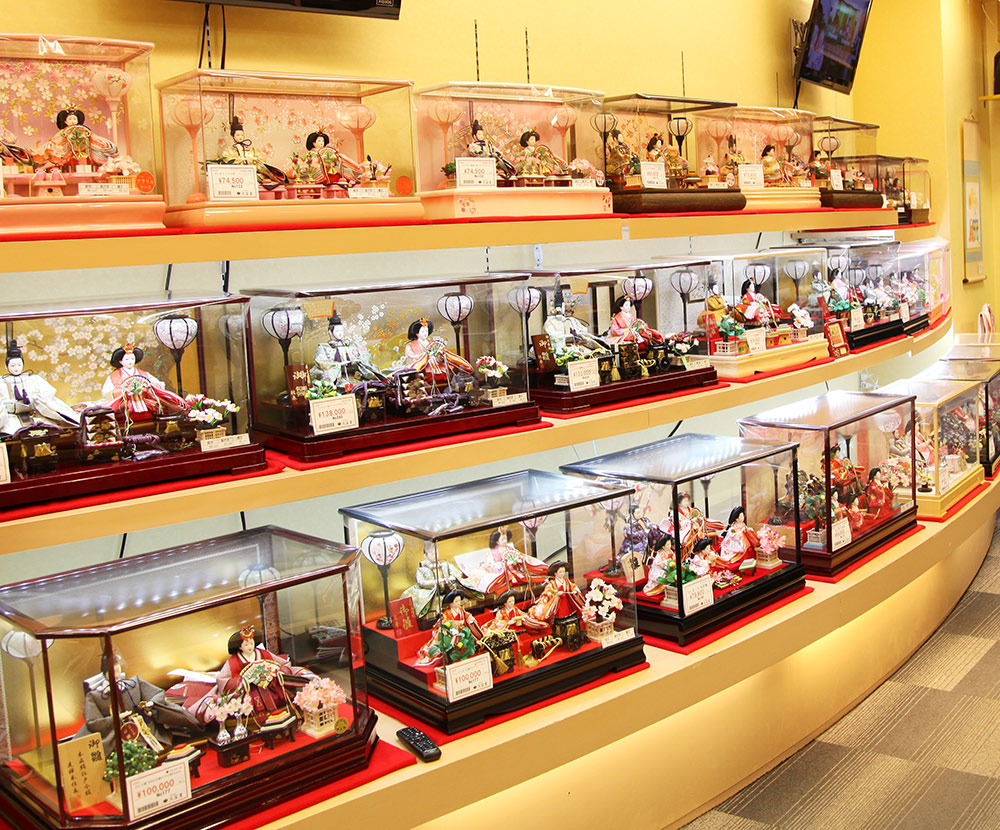 長堀通沿いの入り口を入りますとケース飾りや収納飾り、親王飾り等コンパクトなタイプを中心に展示しております。