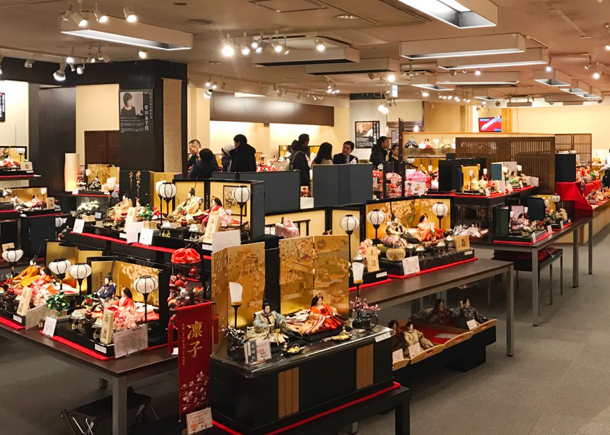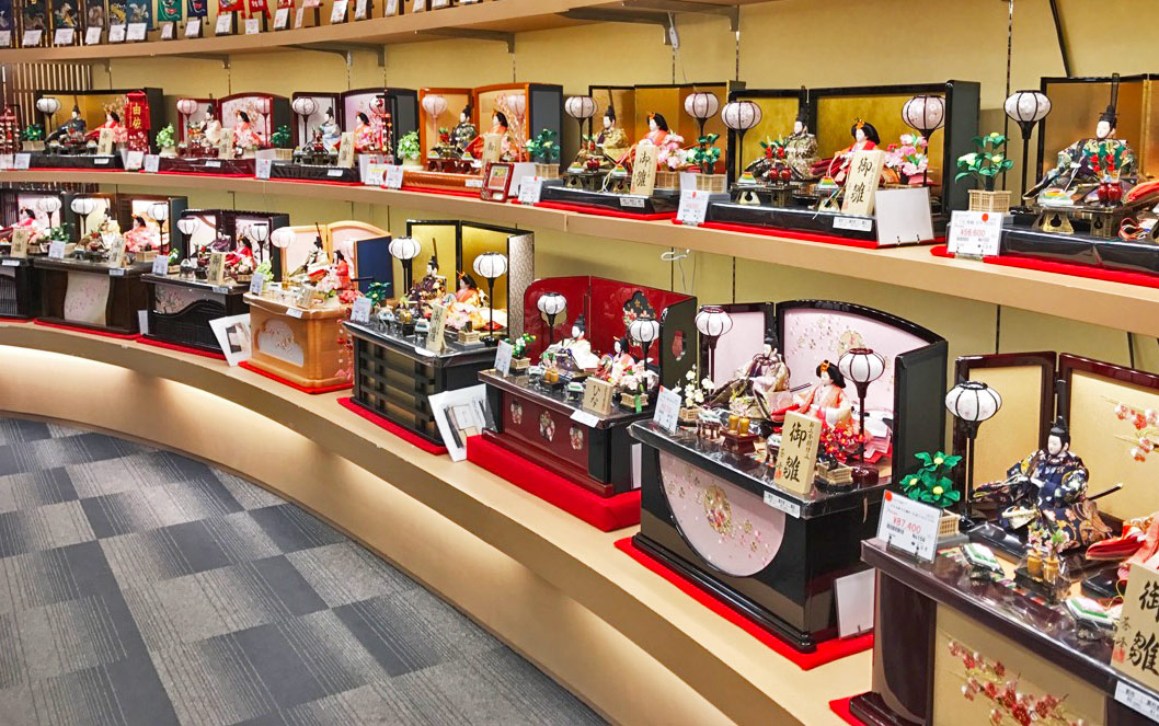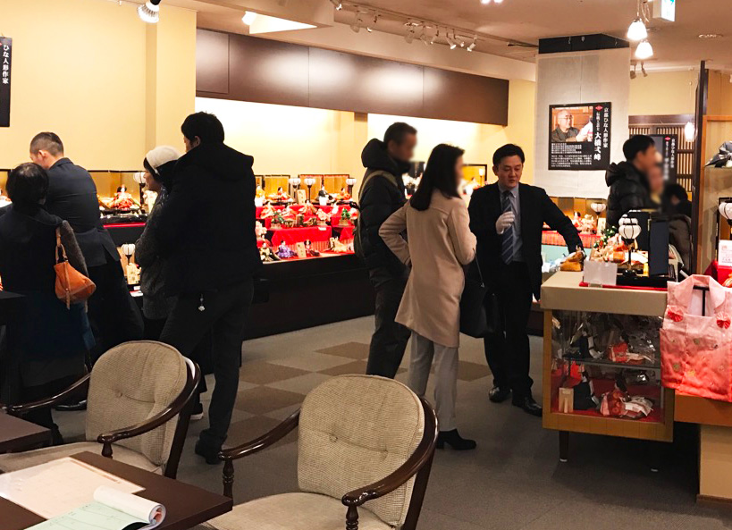 長堀通沿いの入り口を入りますとケース飾りや収納飾り、親王飾り等コンパクトなタイプを中心に展示しております。